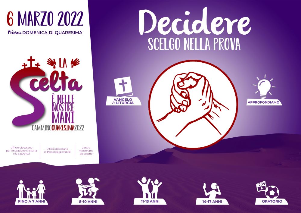 Gli uffici diocesani per la catechesi e la pastorale giovanile, in collaborazione con il Centro missionario diocesano, offrono ai catechisti, agli animatori degli oratori e alle famiglie un percorso di formazione, preghiera e catechesi in occasione della Quaresima 2022. Il percorso, strutturato con schede multimediali settimanali, si sviluppa attorno al Vangelo delle domeniche di Quaresima, ma offre la possibilità di vivere alcune celebrazioni ulteriori.